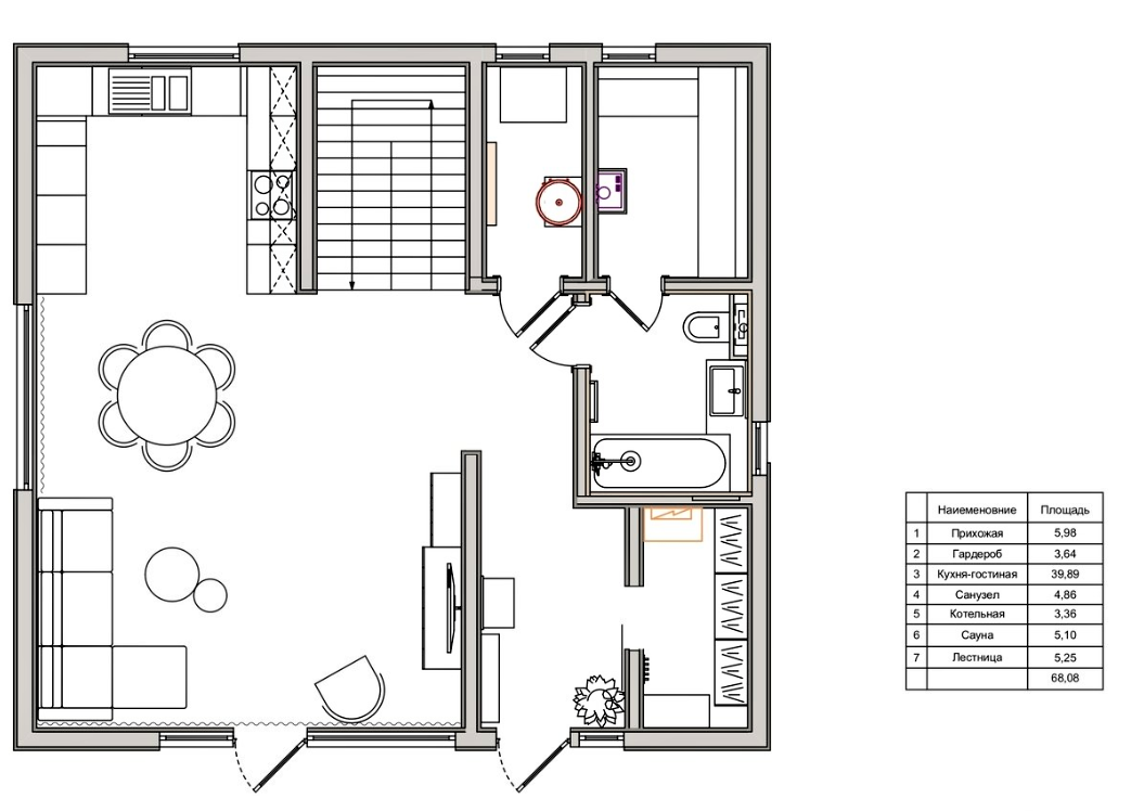 Наши герои построили этот дом в Ленинградской области. Здесь они планируют жить со своей семьей. Изначально, был построен лишь каркас дома, без планировки. Поэтому, чтобы создать грамотную планировку с функциональным интерьером, они на этапе проектирования обратились к дизайнеру. Проект Прихожая Стены в прихожей имеют светлый оттенок. Напольное покрытие выложено крупноформатным керамогранитом. Благодаря большому окну возле входной двери, здесь всегда много естественного света, что является редкостью для прихожей. Слева разместили обувницу с пуфом, а справа организовали просторную гардеробную за сдвижной дверью. Кухня-гостиная Основную площадь первого этажа отдали под кухню с гостиной. Напольное покрытие тоже из керамогранита. Стены обшиты деревом и имеют нейтральный цвет. Кухонный гарнитур напоминает букву П. Фасады серые. В функциональных колонах находится бытовая техника и дополнительные секции для хранения. Между кухней и гостиной расположилась обеденная группа. Обеденный стол допол