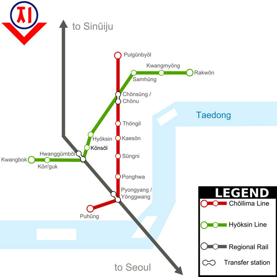 По срокам открытия метро Пхеньян выиграл гонку у южного соседа. Метрополитен Сеула, столицы Южной Кореи, открылся на год позже, в 1974 году. Однако на сегодняшний день его протяженность (487,1 км) превышает аналогичный показатель Пхеньяна (22, 5 км) более чем в 20 раз. Подробная информация о ходе строительства отсутствует, однако известно, что во время проходки тоннеля под руслом реки Тэдонган произошла крупная авария. До сих пор подводный тоннельный переход не построен, а обе линии метрополитена располагаются на одном (правом) берегу.
