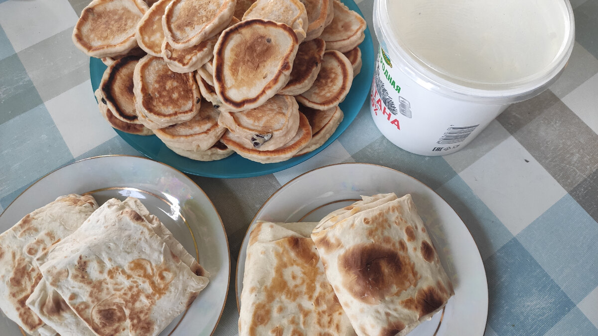 Я всё никак ни нарадуюсь тому, что сделала большую заготовку конвертиков из лавашей. Завтрак собрала за 5 минут. Поджарила на сковороде лаваши, разогрела вчерашние оладьи. Вкусно и сытно.