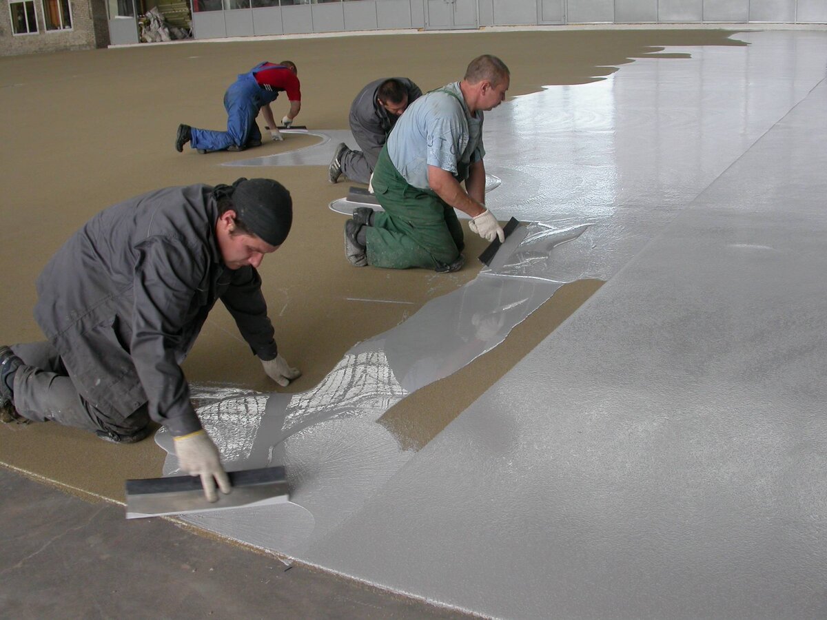 Прежде чем переходить к работе с полимерной смесью, подготавливают основание. Не стоит забывать о грунтовке, чтобы улучшить сцепление. Строительный материал для работы готовят небольшими порциями. Обязательно покрывают полимерный пол защитным лаком. Срок службы покрытия — 10-15 лет.
