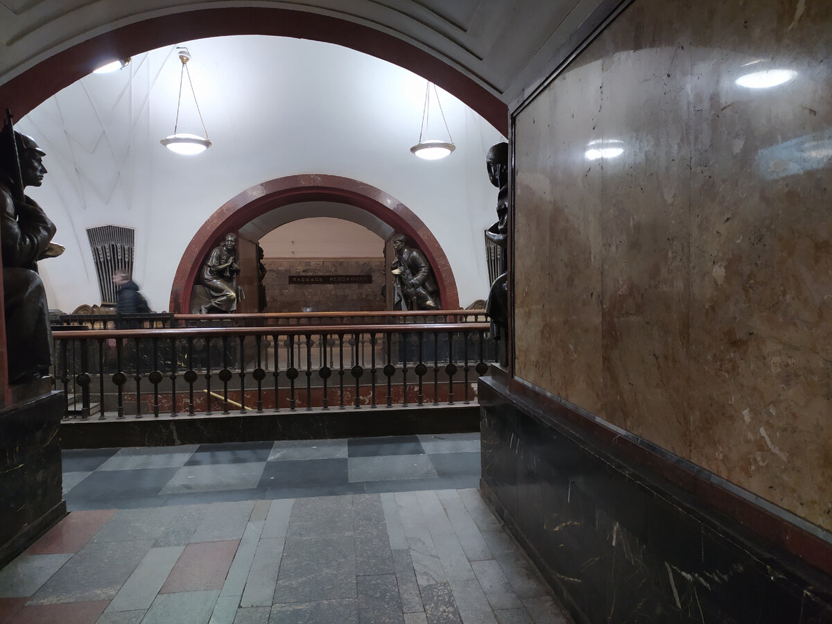 Первоначально на станции не предполагали устанавливать никакие скульптуры, а хотели сделать барельефы на революционную тему. Но архитектору Душкину ни один такой проект не понравился. И родилась идея обратиться к скульптуре Матвею Манизеру, чтобы он украсил станцию статуями на тематику революции, гражданской войны. Он разработал эскизы для 24 фигур, но реализовали только 20. Всего же фигур на станции 76 (многие повторяются). Чтобы фигуры поместились в арках скульптуру пришлось их делать в сидящих позах, некоторые стоят на коленях. Этот факт вызвал много иронии, но работу Матвея Манизера одобрил Сталин лично и шутки прекратились. От западного эскалатора станции в арках расположились статуя красногвардейца с гранатой и солдат с винтовкой – тема гражданской войны и революции 1917 года. Затем идет тема обороны страны после гражданской войны – фигура крестьянина, матроса с наганом, парашютистки, матроса-сигнальщика с линкора «Марат», девушки с винтовкой и пограничника с собакой. Сделали ску