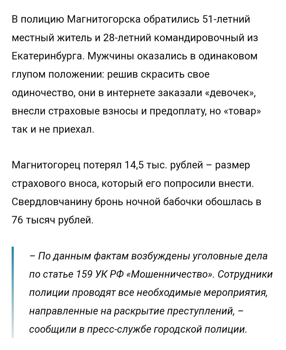 Опять и снова и опять наткнулась я в местных новостях - местный житель и гость город решили развлечься и заказали "ночных бабочек". Заказали, оплатили и сели ждать. И... не дождались в очередной раз. Местный житель заплатил - 14,5 тыс. руб, гость - 76 тыс. руб. В первый раз это читать смешно, второй забавно, в третий начинаешь задумываться - то ли ты живёшь в городе самых глупых мужчин в стране, то ли самых щедрых... Конечно, мне как оптимистке, хотелось бы верить во второе))) У нас здесь что, воздух так действует, вода волшебная? Даже приехавшие теряют голову от возможной встречи с "феечкой". Притом их совершенно не смущает цена. Блин, в столице расценки меньше... Т. е заказывая пиццу, ты оплачиваешь её после доставки, а за " любовь" готов внести предоплату... Может у нас в городе мужики неизбалованы женским вниманием? Или реально привыкли за всё платить...