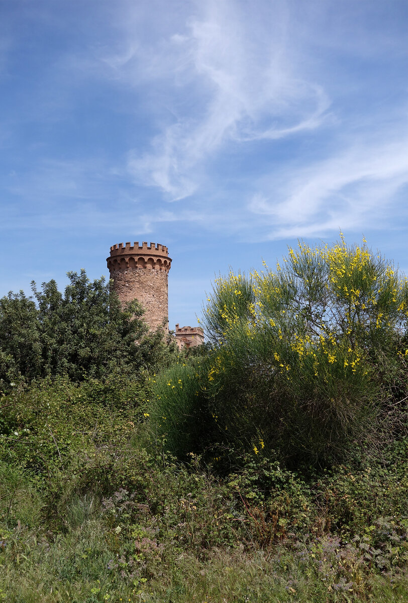 В Санта-Колома-де-Сервельо мы направлялись ради крипты Гауди, но уже на подъезде нас ждал сюрприз - среди деревьев показалась старинная башня. От таких подарков судьбы не отказываются. Оказалось, это целый замок, на гербе отчетливо читалось Torre Salvana. Жаль, даты не было.