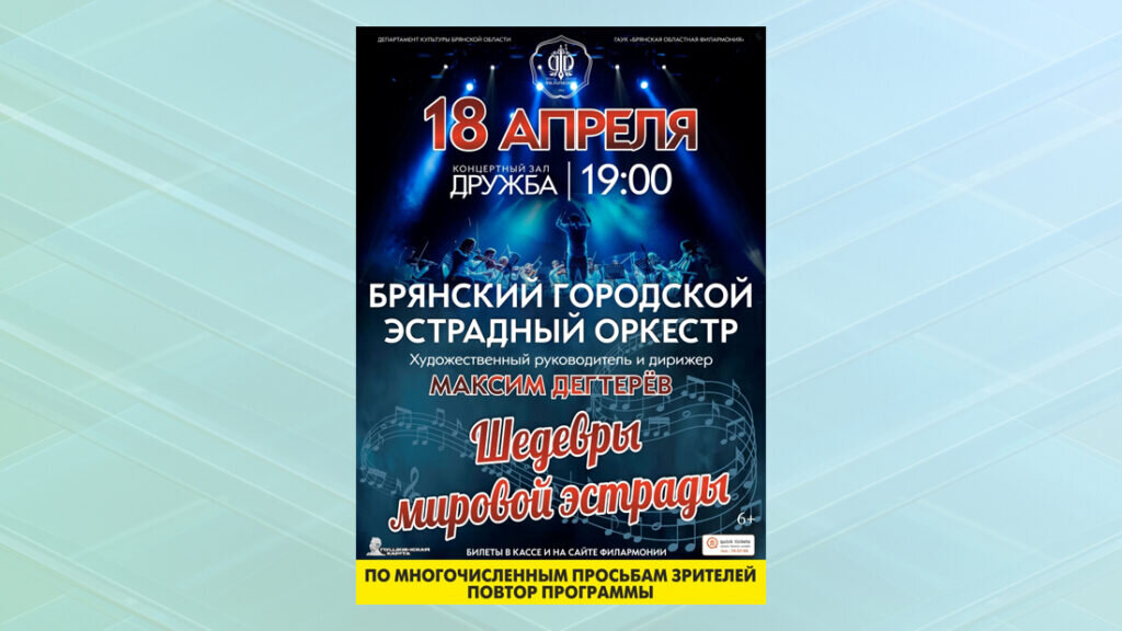 18 апреля на сцене Брянской областной филармонии пройдет шоу «Шедевры мировой эстрады». Прозвучат популярные композиции мировой эстрады в исполнении солистов и Брянского городского эстрадного оркестра под управлением художественного руководителя и главного дирижера Максима Дегтерёва. Начало в 19 часов. Отличительной чертой программы являются современные технические решения, разноплановость, импровизация, эффектность, искромётная лёгкость, освежающий вкус аранжировок знаменитых хитов мировой эстрады. Брянцев ожидает незабываемое красочное шоу, живой звук, музыкальные сюрпризы. Весь вечер для Вас поют солисты оркестра А. Запецкий, С.Авербух, Ю. Душаков, Д. Гриневич, А. Горецкая. 6+ ФОТО: Брянская областная филармония Брянцев приглашают на шоу «Шедевры мировой эстрады»