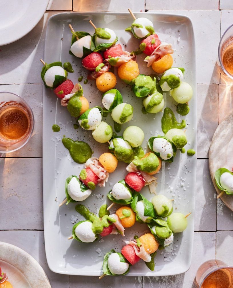 Небольшая изысканная закуска, которую вы можете приготовить за считаные минуты. Сладкая дыня, освежающий арбуз, нежные шарики моцареллы, солёная ветчина прошутто и пикантный соус из базилика и лука. Всё это нанизано на маленькие шпажки, что делает закуску весьма стильной и удобной в употреблении.
