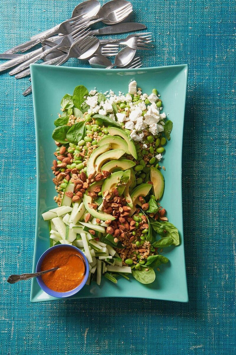 Рецепт здорового салата с большим количеством полезных микроэлементов и клетчатки. Салат дополнен соусом из сладкого жареного перца и рубленого миндаля.
