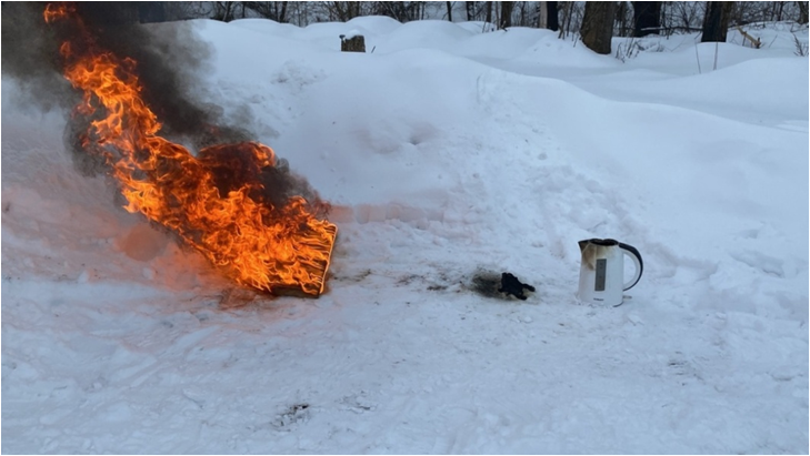 Для испытания понадобилось три источника возгорания: древесина (класс А), бензин (класс В) и электроприбор (класс Е). В качестве электроприбора послужит электрический чайник.