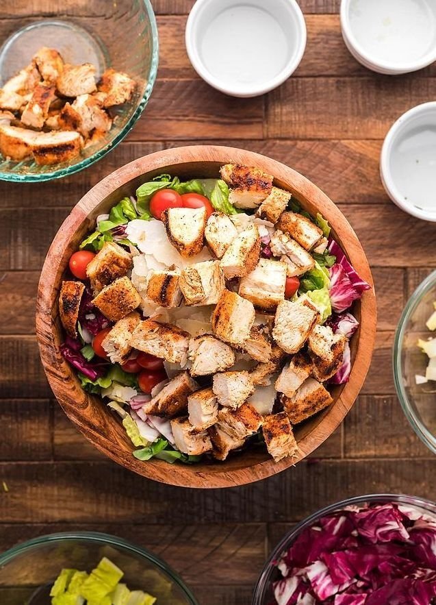 Несколько видов листового салата с обжаренными кусочками пикантной курицы и медово-горчичной заправкой. В этом блюде вы можете использовать любые листья салата: романо, радиччио, эндивий, пекинскую капусту. Лучше взять сразу несколько. Романо обладает мягким, довольно нейтральным вкусом. Радиччио дает небольшую горечь. Эндивий (салатный цикорий) – землистый, легкий и чистый вкус. Время готовки: 25 минут.