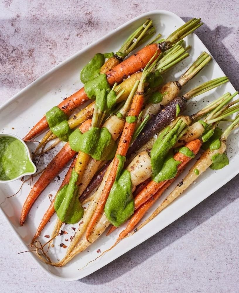 Легкий и вкусный гарнир для вашего ужина или праздничного стола. Радужная морковь запекается в духовке до мягкости, а затем покрывается соусом из базилика, мяты, лука и чили. Чтобы морковь имела более аутентичный аромат, лучше запекать ее вместе с частью ботвы. Такое сочетание имеет уже много интересных пикантных вкусов, так что вы можете подавать этот гарнир с простым белком. С обычной обжаренной курицей.