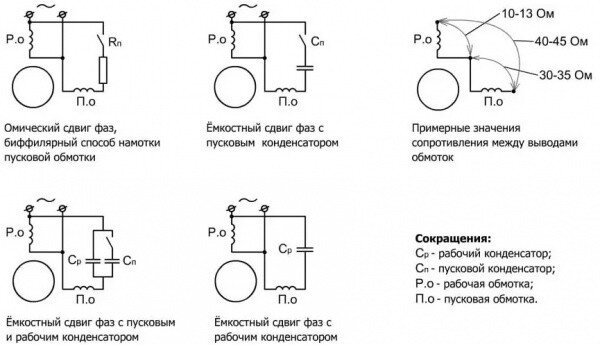 Когда в однофазных движках присутствует только одна обмотка. То мы наблюдаем картину, когда поле внутри статора не вращается, а пульсирует. То есть толчок для пуска не происходит, пока собственноручно не раскрутить вал. Для того чтобы вращение могло происходить самостоятельно, добавляем вспомогательную пусковую обмотку. Это вторая фаза, она перемещена на 90 градусов и толкает ротор при включении. При этом двигатель все равно включен в сеть с одной фазой, так что название однофазного сохраняется. Такие однофазные синхронные моторы имеют рабочую и пусковую обмотки. Разница в том, что пусковая действует только при включении заводя ротор, работая всего три секунды. Вторая же обмотка включена все время. Для того чтобы определить где какая, можно использовать тестер. На рисунке можно увидеть соотношение их со схемой в целом.