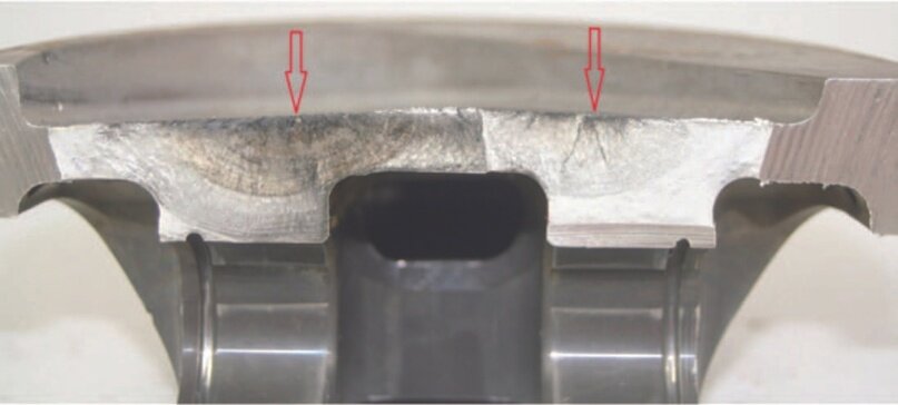 Фото 1. Стрелка слева указывает на место зарождения исходной усталостной трещины на днище поршня. От нее началось распространение усталостных деформаций, с характерными концентрическими «линиями усталости», которые напоминают следы от волн на песчаном пляже. Почти одновременно образовалась вторая усталостная трещина – правее – над бобышкой поршневого пальца. И в итоге две волны трещин соединились примерно посередине.