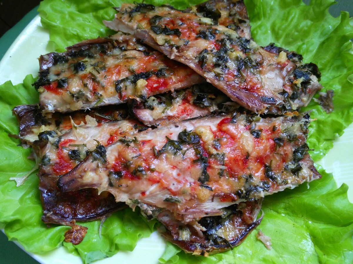 Скумбрия свежая - 3-4 шт., кетчуп - 3 ст.л., сыр - 100 г, зелень рубленая - 2-3 ст.л., чеснок - 2 ср.зубка, соль, перец чёрный, масло растительное - 2 ч.л.