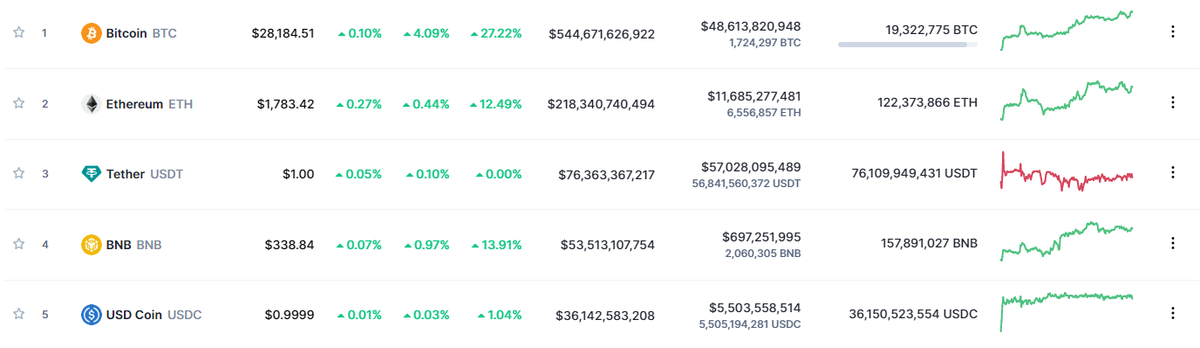 Сегодня цена главной криптовалюты продолжает расти: на момент написания заметки биткоин стоит 28 178 долларов. За сутки он подорожал на 4.12*%*, а за неделю - на почти 30%. Рыночная капитализация монеты составляет 544 миллиарда долларов.
