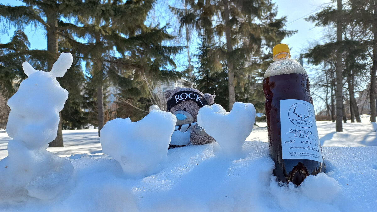 Моё почтение любителям пенного! Веснас! Солнышко светит, птички поют, можно даже пойти снеговика полепить! Что собственно народ и делает! Сразу оговорюсь, что сердечки лепили не мы с Кузьмой, у нас способностей, кроме как накатать традиционного снеговика, да, быть может, слепить болтяру семивершковую (привет дедушке Фрейду), увы, не хватит! Так что мы просто воспользовались, так сказать, чьими-то стараниями! В общем сегодня у нас на пробу очень любопытный экземпляр от домашней пивоварни Rammbock Brauerei! Так что сим чудесным утром, употребим, так сказать, эксклюзив! Так уж и быть, коль пред нами литр, то Кузьма свою пайку может лакать из собственной стекляхи! Послушаем же пивовара и узнаем что за пиво попало к нам в руки: Бельгийский темный эль с гранатовым соком. Сухой как порох. Терпкий как последний поцелуй. Беспощадный как пуля дуэльного пистолета... Pulverkuß - пороховой поцелуй. Вдохновлено песней Раммштайн - Roter Sand. Roter Sand und zwei Patronen