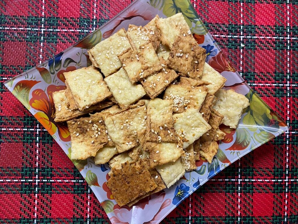 Домашний луковый крекер с кунжутом - это отличный и вкусный перекус, которым можно похрустеть абсолютно в любом месте. Это печенье намного вкусней магазинных снеков, готовиться очень быстро и просто, а самое главное - вы знаете его состав. Оно скрасит собой просмотр любого фильма и посиделки с друзьями. Делимся рецептом. Понадобиться: Готовим: 1. Репчатый лук очищаем от кожуры, нарезаем произвольными кусочками и помещаем в чашу блендера. 2. Добавляем к луку растительное масло, воду, соль, сахар и пробиваем все в пюре. 3. В глубокую миску просеиваем муку вместе с разрыхлителем и добавляем луковое пюре. Замешиваем тесто. Оно получиться вязким. 4. Противень застилаем силиконовым ковриком или пергаментом для выпечки и по нему размазываем наше луковое тесто тонким слоем. Сверху посыпаем кунжутом. 5. Убираем противень в предварительно разогретую до 200℃ духовку на 10 минут. Затем достаем и нарезаем тесто на кусочки (ранее тесто было слишком жидким для формовки). Убавляем температуру до 170℃