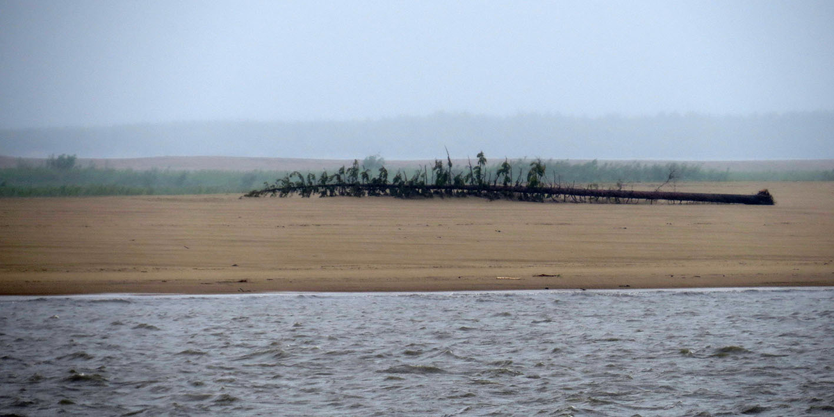 Хоть Лена и самая красивая река на Земле, а на всю её 4400-километровую длину красоты не хватает. В нижне-среднем течении, от последних Столбов до полярного круга, Лена больше похожа на Обь, где коренных берегов не видать за тальником на островах и поймах. Участок реки от устья Вилюя до устья Менкере так и называют в народе - Сорок островов, хотя по факту островов там во-первых четыреста, а во-вторых если это название растянуть от, скажем, Покровска до Жиганска - оно и этим местам вполне подойдёт. Первые 740 километров ленского круиза (почти половина!) проходит в примерно таких пейзажах: Сорок островов тянутся и за Жиганск, однако ближе к этому посёлку по левому берегу проступают обрывы. Один из них, километрах в 40 выше Жиганска, привлекает взгляд деревянным знаком - вот и тут его можно различить на вершине треугольного яра. По пути вверх по течению теплоход встаёт здесь на зелёную стоянку: Команда причудливо швартует его за мощные канаты к деревьям: У трапа пассажиров ждёт капитанска