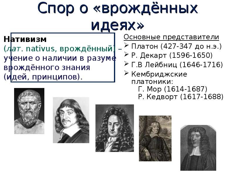 Врождённые идеи или иннатизм (лат. innātus «врожденный») — это представления и знания, которые не могут быть приобретены, поскольку они не имеют отношения к чувственному миру (напр., математические и логические аксиомы, нравственные начала). Истоки теории можно найти в концепции Платона «знании как припоминании» идей, которые душа будто бы созерцала до того, как она появилась на земле. Весь чувственный мир, по мнению Платона, есть порождение вечных, ни отчего не зависящих «идей». В каждом человеке, говорил он, со дня его рождения заложены истинные знания, которые, затем только как бы оживляются под воздействием внешних ситуаций. С появлением христианства мыслители, такие как Августин, развили теорию о том, что Бог непосредственно «вкладывает» вечные идеи в душу человека. Дальнейшее развитие теории идей произвёл Декарт. Побудило его к этому противоречие в его философской концепции, где при рассмотрении независимых друг от друга мыслящей и протяжённой субстанций возникал вопрос, как чело