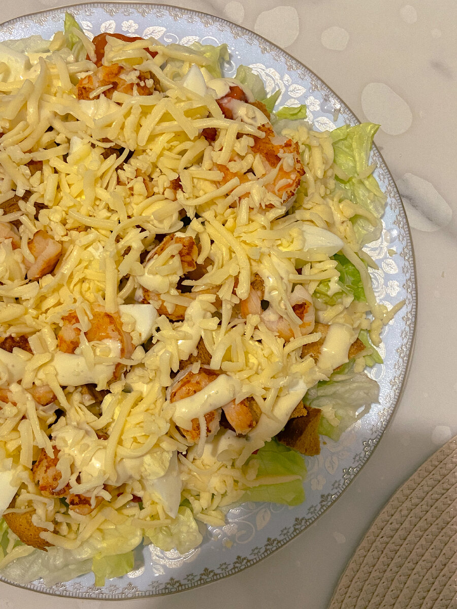 Вкусный и быстрый рецепт салата Цезарь с креветками (с готовым соусом)