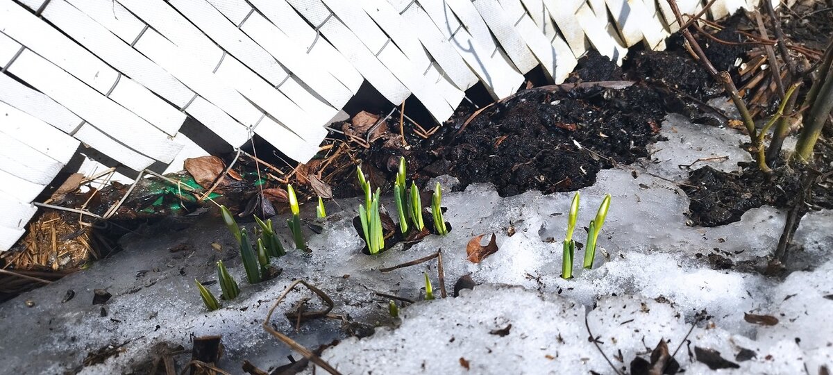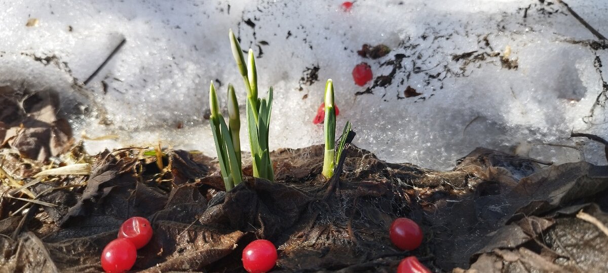 Тепло пришло, бегут ручьи, осели и стали рыхлыми сугробы, дни стали длиннее и, наконец, появилось солнышко. Солнечных дней стало больше. Потихоньку тает снег, открывается земля по краям клумб. И теперь стали видны, уже готовые вот-вот раскрыться, галантусы. Ещё два-три теплых дня и я увижу красоту!