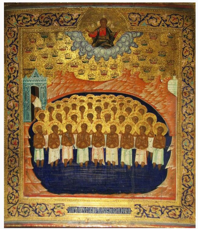 Страстоте́рпцы Христо́вы четы́редесяте,/ во гра́де Севасти́йстем му́жественно пострада́вшии,/ чрез огнь и во́ду проше́дшии,/ в поко́й ве́чный вше́дшии,/ моли́теся о нас ко Го́споду/ да жизнь ми́рну сохрани́т// и ду́ши на́ша спасе́т, я́ко Человеколю́бец.
