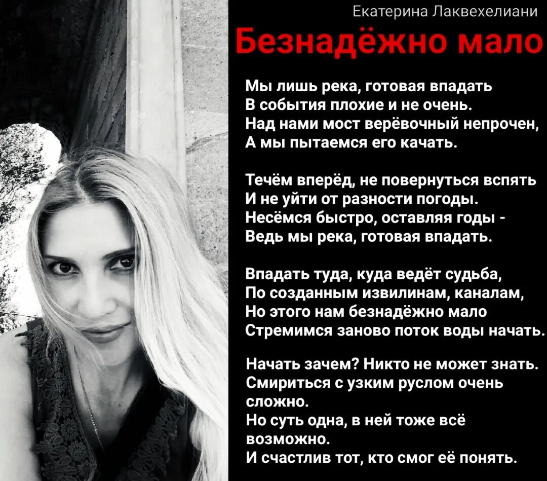 Годы ведут к осознанию и осмыслению. Многое сделано второпях. Много сил тратилось зря. А всё намного проще! Моя страничка на Литрес. Читайте мои книги Моя группа ВКонтакте. Заходите, читайте Больше моих стихов по ссылке https://stihi.ru/avtor/stkatrina © Copyright: Екатерина Лаквехелиани, 2023 Свидетельство о публикации №123021505908