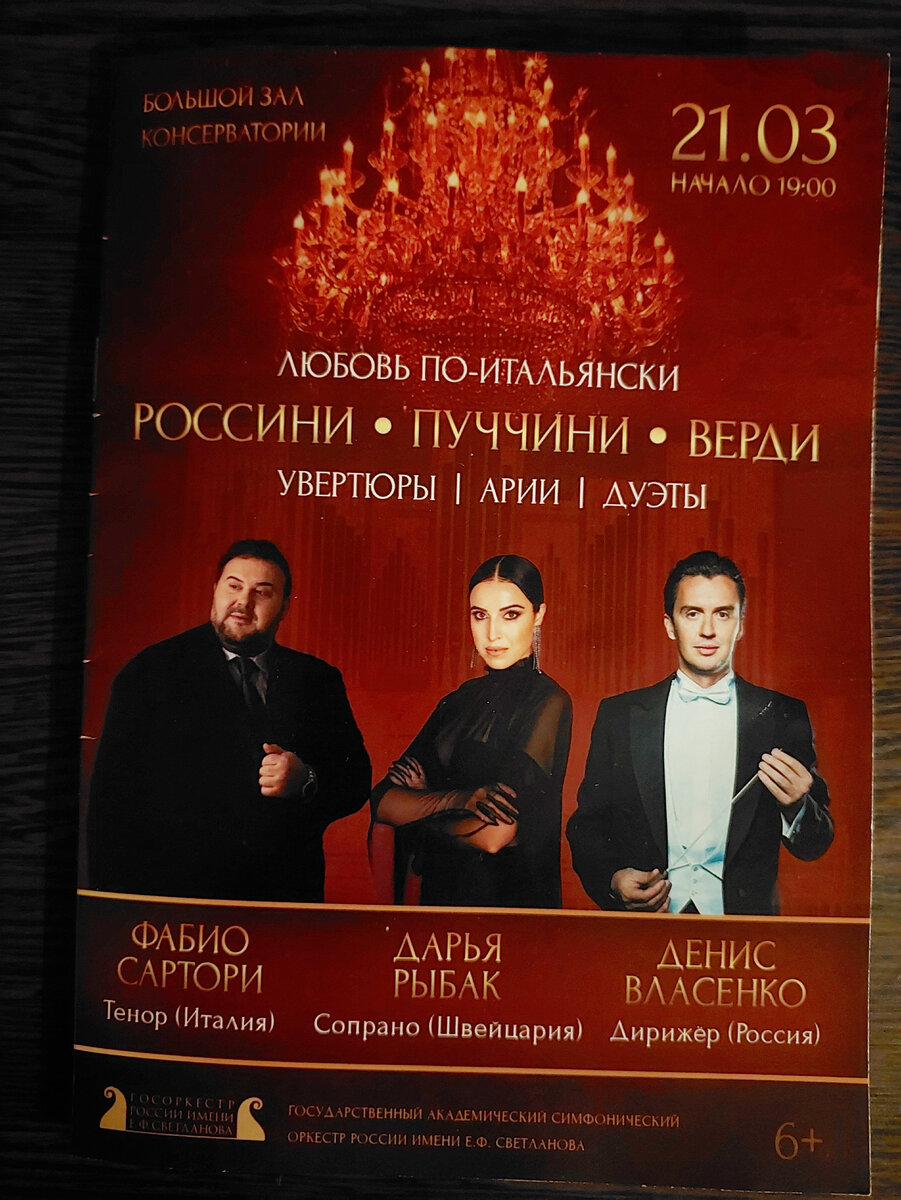 Была вчера в Большом Зале Консерватории. Билеты покупала через "Artparad.ru", неизвестно как появившемся у меня в телефоне. Получила огромнейшее удовольствие от концерта. Был полный аншлаг. Зал Консерватории был заполнен полностью. Играл Государственный Академический Симфонический Оркестр России имени Е.Ф.Светланова. Дирижер Денис Власенко. В программу концерта вошли : Моцарт. Увертюра к опере "Дон Жуан" . . . Верди. Арию Макдуфа из оперы "Макбет" исполнил Фабио Сартори итальянский оперный певец, выступающий на многих оперных площадках Берлина, Барселоны, Мадриде, Вене, часто выступает на сцене Ла Скала. . . . Пуччини. Арию Лью из оперы "Турандот" исполнила Дарья Рыбак молодая швейцарская оперная певица. . . . Пуччини. Дуэт из оперы "Мадам Баттерфляй" исполняют Дарья Рыбак и Фабио Сартори. . . Много рассказывать не буду, лучше посмотрите видео и послушайте замечательное пение. Кстати, давно не видела, чтобы так массово спрашивали - а нет ли лишнего билетика? Засим, кник