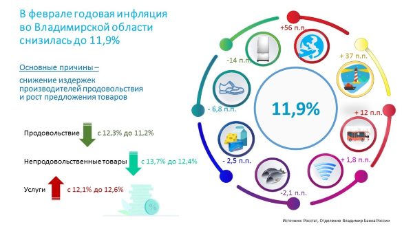 Пресс-служба Банка России отделение Владимир сообщила, что рост цен на продовольствие уменьшился до 11,2%. На снижение темпов роста цен повлияло увеличение производства молока во Владимирской области, а также уменьшение расходов сельхозпроизводителей на приобретение кормов. В свою очередь, эти обстоятельства привели к расширению предложения на молоко, сыр и сливочное масло. Увеличение поставок рыбы и морепродуктов в регион в результате увеличения вылова российскими предприятиями привел к уменьшению цен на рыбные продукты. В сфере непродовольственных товаров в феврале также обнаруживается уменьшение роста цен до 12,4%. Развитие параллельного импорта и сдержанная потребительская активность владимирцев привели к замедлению роста цен на холодильники, стиральные машины и телевизоры. Удорожание данных товаров произошло в феврале прошлого года после ослабления рубля. После ухода с рынков ряда иностранных брендов одежды и обуви, отечественные производители текстильных и кожаных изделий нарасти