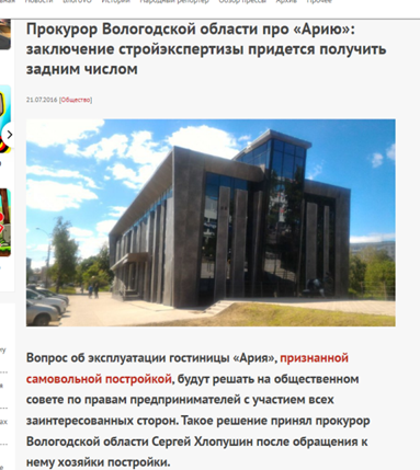 Между тем, настоящие законные попытки ввести самовольную постройку через суд тоже продолжались, но также безрезультатно - 14.10.2016 Арбитражный суд Северо-Западного округа постановил решение Арбитражного суда Вологодской области от 26.01.2016 и постановление Четырнадцатого арбитражного апелляционного суда от 16.06.2016 оставить без изменения, а кассационную жалобу общества с ограниченной ответственностью "Англитер" - без удовлетворения.