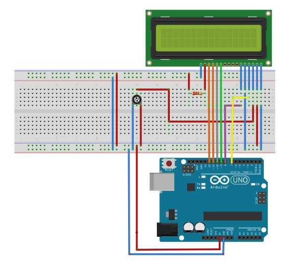 Нам понадобится подать питание на подсветку дисплея. Выводы 15 и 16 LCD дисплея – это анод и катод встроенного светодиода, который служит в качестве подсветки LCD. Мы подключаем их к шинам питания, как и любой другой светодиод к источнику напряжения 5 вольт: анод к положительному выводу напряжения, а катод к GND, с последовательно включенным токоограничивающим резистором. Вы можете использовать резистор номиналом 100–220 Ом. Был использован 1 кОм, так как с резистором 220 Ом подсветка была слишком яркой для моей камеры, чтобы снять видео. Если хотите, то можете заменить резистор потенциометром и сделать подсветку регулируемой.