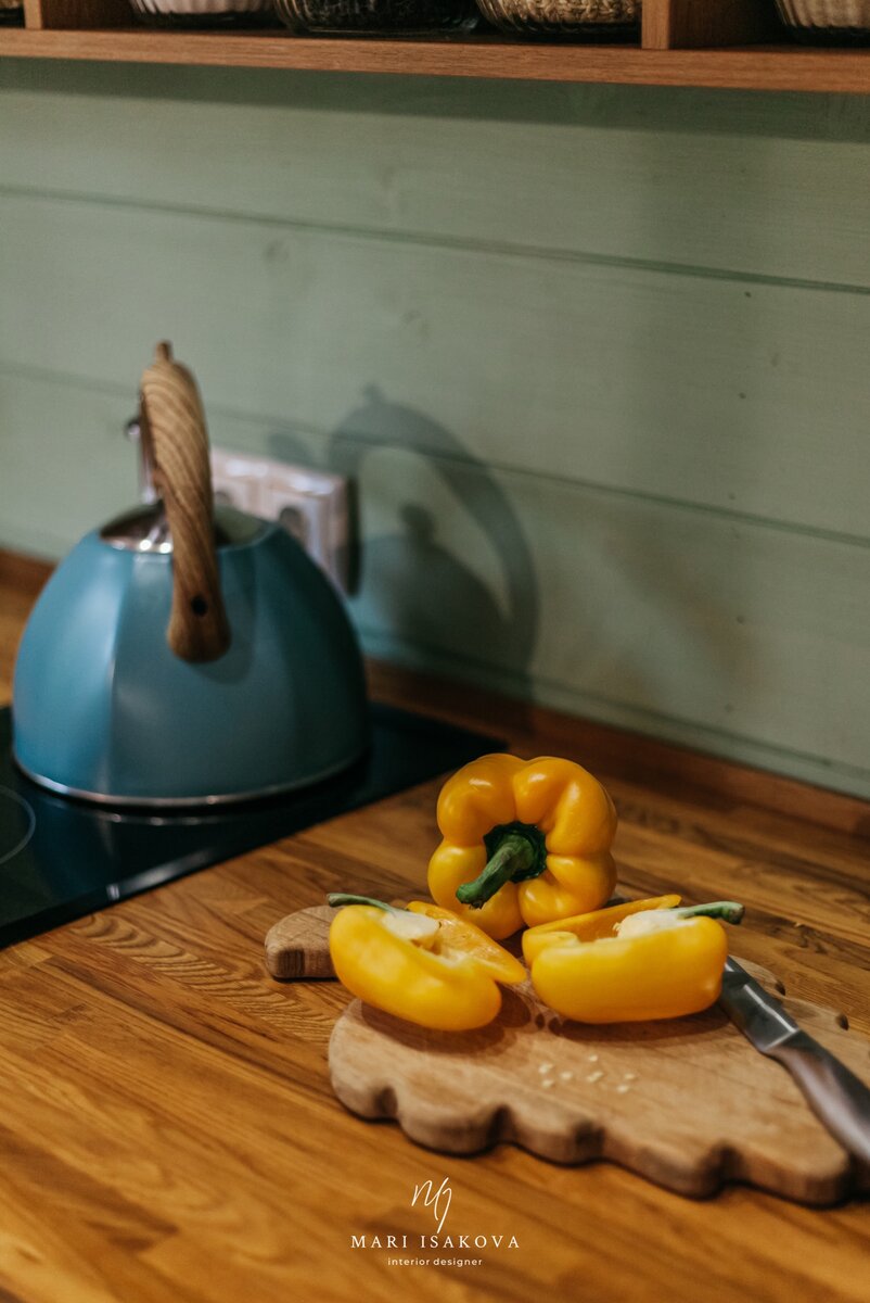 Площадь кухни дома-бани составляет 10 м². И для меня была важна не только общая атмосфера кухни, но и каждый нюанс в отдельности: стеклянные баночки для сыпучих продуктов, чайник в тон фасадов шкафов, разноцветные ручки с разным узором на красочных дверях шкафчиков. Они придают некую игривость интерьеру и продолжают флористическую тему экстерьера внутри всего пространства дома. Немаловажную роль сыграло грамотное расположение всех кухонных предметов в пространстве помещения.