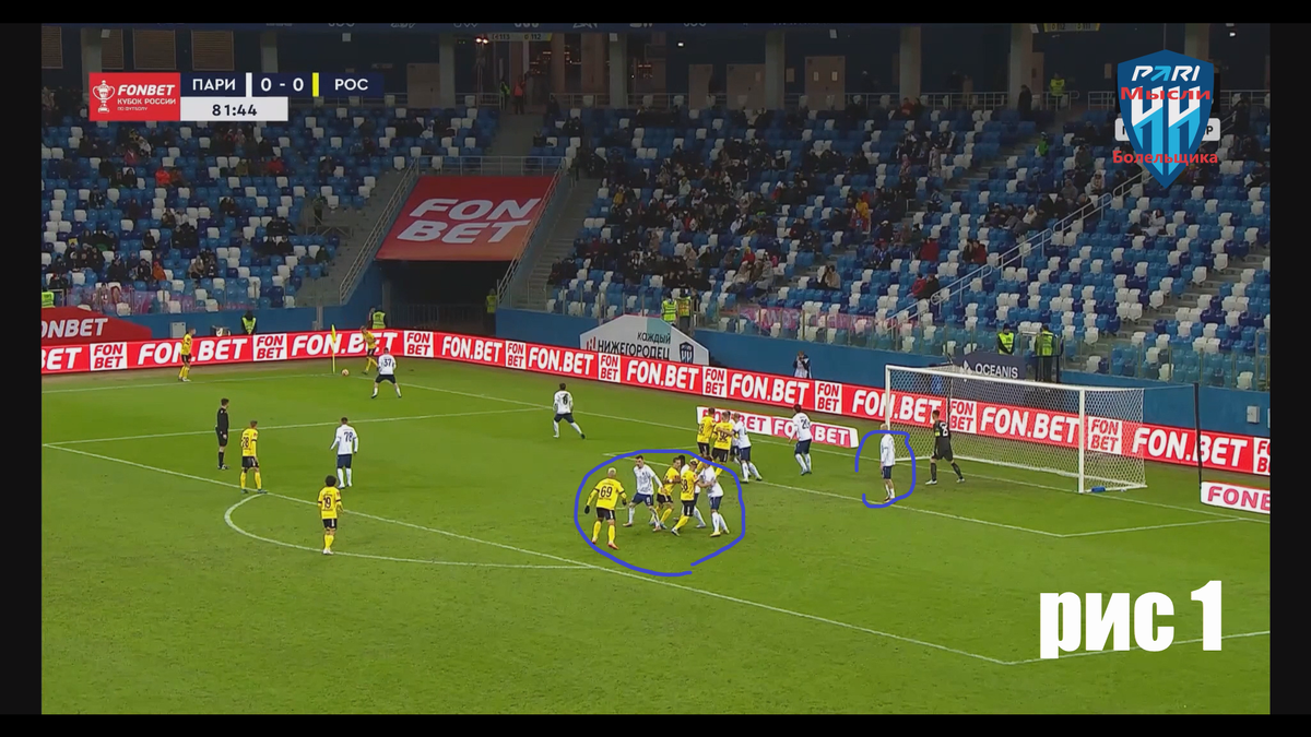 Делать видео с разбором игры нет ни времени, ни смысла. Уже прошла еще одна игра. Разберем только забитый гол и попытаемся выяснить кто виноват и можно ли было не допустить. Итак, в момент подачи (рис1) мы видим, что Александров держит дальнюю штангу, а трое нижегородцев в середине штрафной опекают троих ростовчан. Если присмотримся, то увидим, что Тугарев переглядывается с партнером, это важно. Селява отталкивает Масоэро и встает к Янсане вместо Тугарева. Момо не замечает подмены, смотрит на мяч. Следует подача. Масоэро, бросив своего идет на мяч в гущу игроков (зачем?) (рис2), Александров делает также движение к мячу (зачем?) (рис2). Момо держит подмену (Селяву). Тугарев в это время, понимая, что мяч летит в скопление игроков, начинает перемещение ближе к дальней штанге. Так как Александров оставил зону, там было свободно и форвард «Ростова» почуял, что мяч может отлететь именно туда (рис2). А третий (Голенков) обегает в момент подачи Берковского и тоже направляется в место приземле