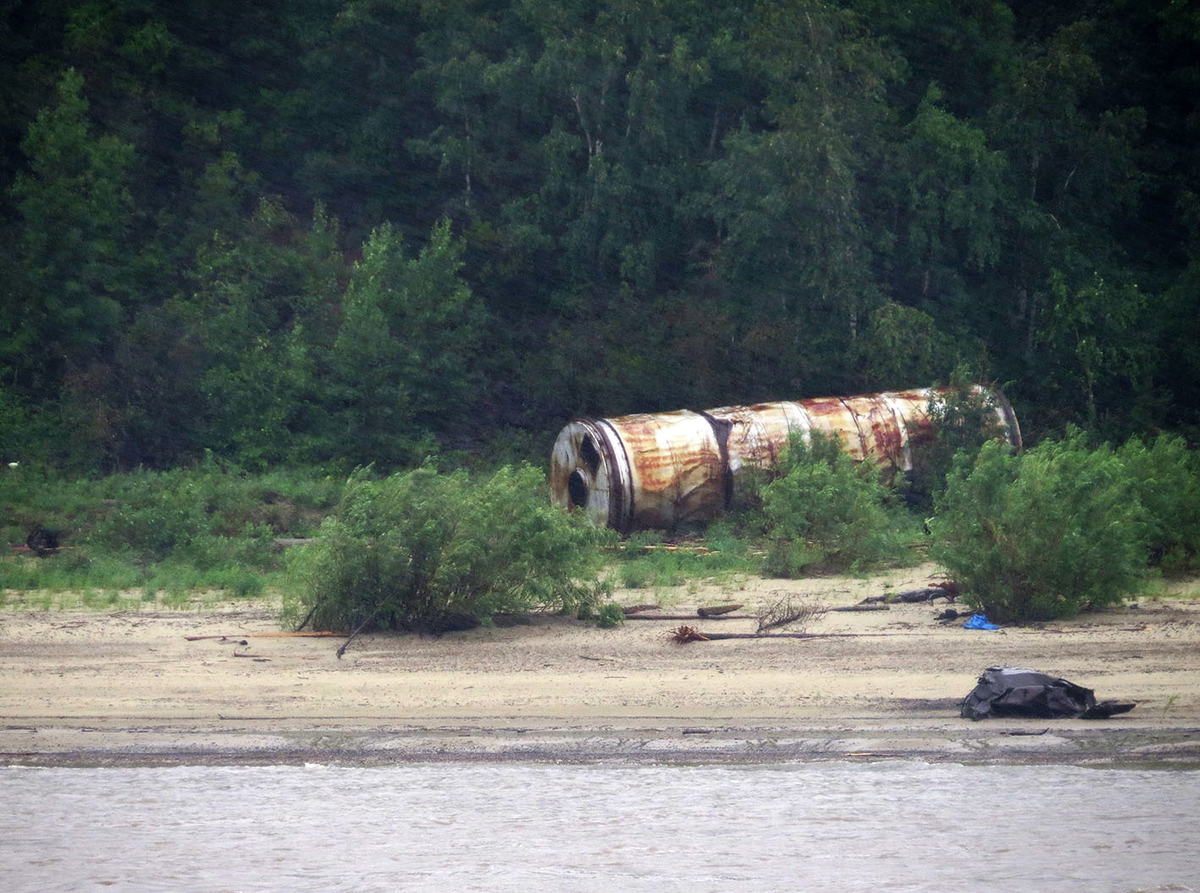 Выйдя на палубу круизного "Михаила Светлова" дождливым полднем, первым делом я увидел на тёмном берегу блестящее нечто, похожее на отработавшую ступень ракеты с космодрома "Восточный". Они действительно падают в окрестную тайгу, но по "принципу зебры" всё же вероятнее, что это бак водонапорки: