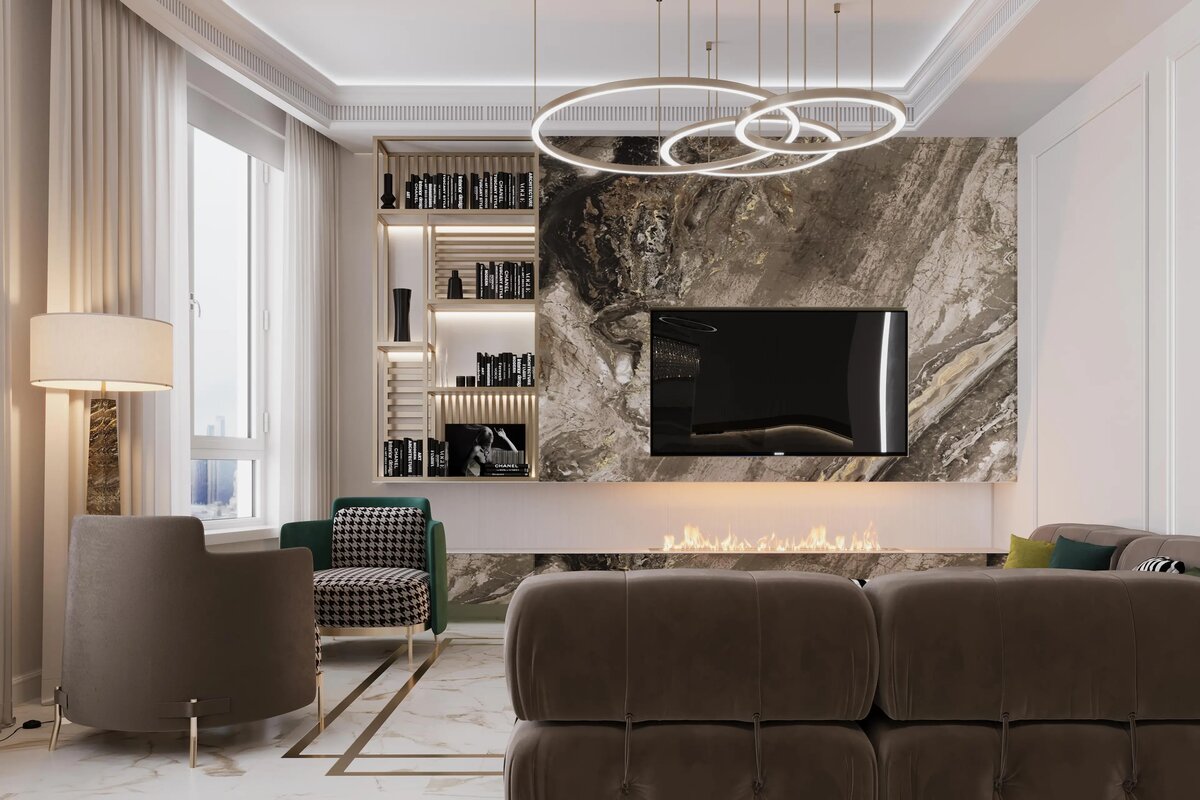 Отделка стен под природный камень делает интерьер харизматичным, а широкий ассортимент технологий и материалов позволяет выполнить декоративные композиции на любой вкус. Динамичный рисунок природного мрамора Канонический прием декорировании интерьеров ар-деко — отделка пола и стен полированным мрамором. Роскошь и глянец такого покрытия наилучшим образом сочетается с блеском хрусталя и золотистым сиянием аксессуаров. В современных же композициях с застывшими линиями и формами выразительный рисунок прожилок мрамора придает интерьеру динамику, вводя в упорядоченное пространство отголосок бушующих стихий. Чтобы сделать акцент на камне в этом проекте, наши дизайнеры выбрали крупные панели и не стали закрывать их мебелью. В результате и кухонный фартук, и ТВ-зона, и барная стойка больше не выглядят утилитарно, а скорее воспринимаются как арт-объекты. Имитация скалы Сочетание панелей под камень и бетон с красной или белой подсветкой придает интерьеру необычайную притягательность. Г