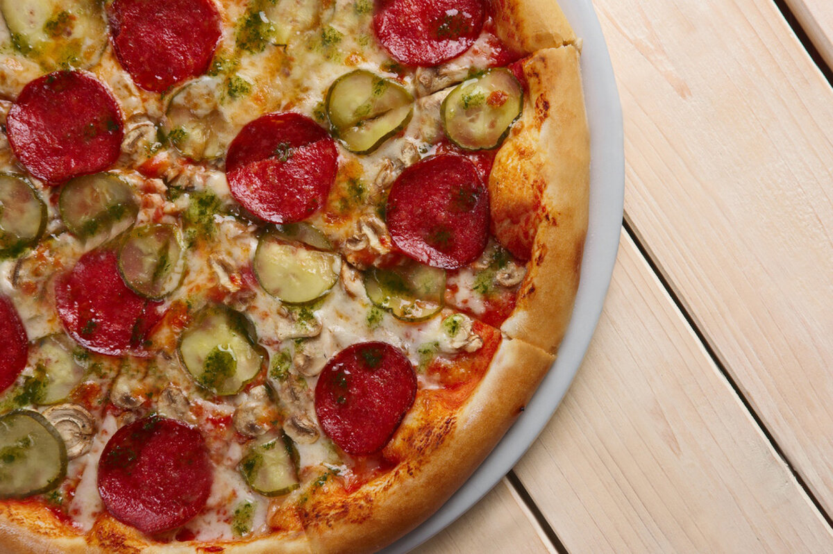Пицца с маринованными огурцами и пряной колбасой в духовке