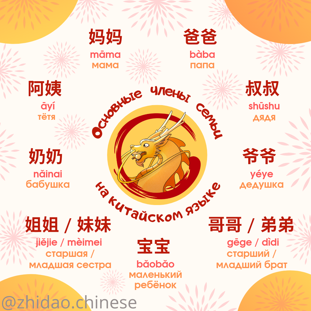 #zhidao_способы_сказать💭 Сегодня делимся с вами названиями основных членов семьи на китайском языке! 👨👩👧 🔸妈妈 māma мама 🔸爸爸 bàba папа, отец 🔸叔叔 shūshu дядя 🔸阿姨 āyí тётя (по матери) 🔸爷爷 yéye дедушка 🔸奶奶 nǎinai бабушка 🔸宝宝 bǎobǎo маленький ребёнок 🔸哥哥 gēge старший брат 🔸弟弟 dìdi младший брат 🔸姐姐 jiějie старшая сестра 🔸妹妹 mèimei младшая сестра 📝 Ссылка на карточки Quizlet для изучения новых слов: https://quizlet.com/_bh7w7m?x=1jqt&i=2r5snr ❗В Quizlet вы можете послушать произношение всех фраз! Для этого нажмите на значок микрофона 🔊 📚 Хотите, чтобы Вы или Ваш ребенок заговорили на китайском? Напишите нам для записи на групповые / индивидуальные занятия! 🎓