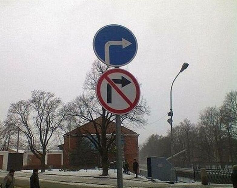 По статистике, автомобиль является самым популярным транспортным средством. При чем ежегодно их на дорогах становится все больше и больше. Из-за чего на дорогах случаются курьезные и забавные ситуации. Но может быть и дело то вообще не в самих автомобилях, а в плохих дорогах, которых у нас в стране очень много. Предлагаю посмотреть очередную подборку глупых, смешных и в то же время нелепых ситуаций на дороге. Которые были запечатлены не только в России, но и в других странах. Да, да смешные ситуации происходят не только в нашей стране. Можете в этом сами убедиться, посмотрев фотографии. Приятного просмотра! Фотографии смешных ситуаций на дороге. 1. Представьте ситуацию, вы ответственный водитель. Который всегда соблюдает правила дорожного движения. И вам нужно повернуть на право, а вы видите два таких вот знака. Чтобы вы в таком случае сделали? То можно поворачивать, то запрещено. Пора бы дорожным службам уже определиться. 2. Не зря же говорят, что свинья грязи везде найдет. Вот у жи