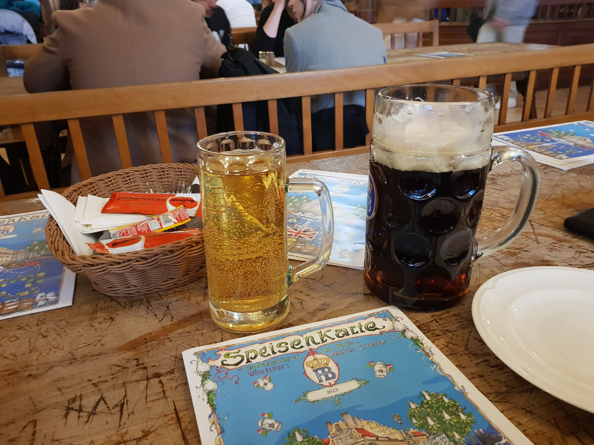 Когда Ирина написала, что хотела бы поесть немецкую еду, типа колбаски с квашеной капустой, меня это нисколько не обрадовало. Я практически ничего не люблю из немецкой еды. Ну, белые сосиски ещё как-то, но не на завтрак, а немцы их едят именно по утрам. Ну, брецели, нормально, только счищая соль, а от рульки у меня болит поджелудочная, её надо есть видно с пивом, а я не пью. Но идти придется, ведь я согласилась, хотя мне бы лучше погулять по Английскому саду, я вообще не перевариваю атмосферу пивняка. Однако муж говорит, что раз русская норвежка хочет немецкой еды, да ещё в понедельник, когда большинство ресторанов не работает, то надо идти в Хофбройхаус. Это самое аутентичное баварское пивное место в Мюнхене и людям нравится. ссылка Смотрите видео: В знаменитом пивном ресторане НВ в Мюнхене Я решила сделать Ирине экскурсию по ресторану: сначала мы проходим насквозь весь зал, показываю ей места, где лежат именные кружки завсегдатаев, потом выбираем столик напротив музыкантов. Но их пок