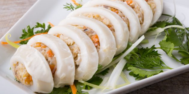 Перед подачей фаршированные кальмары порезать и украсить свежими овощами.