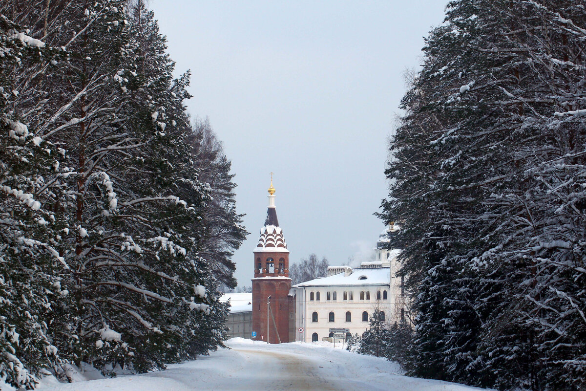 Среди лесов, на берегу живописной речки Сольба, возвышаются храмы и башни Николо-Сольбинского женского монастыря. Монастырь находится в глухом месте, как будто затерялся среди лесов, здесь действительно можно найти спокойствие и уединение от нашего беспокойного мира, во всяком случае, зимой, когда мы здесь и были. В местечко Сольба, где находится монастырь, мы выехали из Углича, это около 80 км пути. Отъехав несколько километров от города, дорога опустела, лишь изредка нам попадались встречные автомобили, и чем ближе мы подъезжали к Сольбе, тем меньше их встречали, только заснеженные леса и изредка встречающиеся деревушки за окном. Ближайший город от монастыря находится в 65 км – это Переславль-Залесский, а само местечко Сольба, это именно местечко, ни деревня, ни посёлок, здесь расположен только монастырь и ещё пара неизвестных строений за забором, да, монастырский магазинчик.