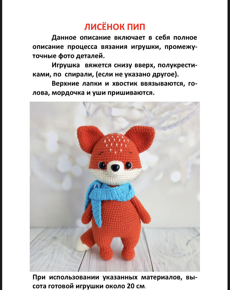 «Дорогие друзья! Хочу поделиться с вами моим новым описанием. На просторах интернета мне встретился простой и интересный способ вывязывания щёчек и, благодаря этому, появился лисенок Пип. Игрушка очень простая. Ручки и хвост ввязываются, голова, мордочка и уши пришиваются. Глаза и нос на безопасном креплении. Но вы можете всегда оформить игрушку по своему усмотрению. Высота готового лисёнка, связанного из полухлопка, около 20 см. Из Ализе Софти около 25 см. Описание содержит промежуточные фото. Если вы распечатываете мастер-классы перед работой, то вам будет достаточно формата А5 (либо 2 станицы на А4) Описание выполнено на белом фоне черным, хорошо читаемым шрифтом.» - Слова автора https://vk.com/o.romakhina