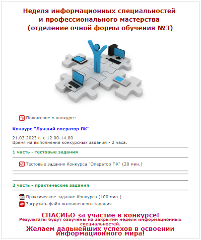 Одним из традиционных конкурсов в Омской автотранспортном колледже в рамках недели информационных специальностей стал Конкурс "Лучший Оператор ПК". В нем приняли участие студенты 1 курса групп отделения очной формы обучения №3. Ребята в течение двух часов выполняли тестовые и практические задания, результаты которых предлагаем оценить независимым экспертам. Перейти к оценке работ
