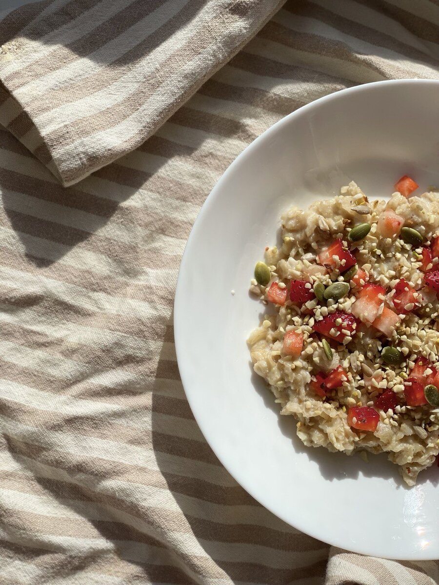 Я не огромный любитель овсянки, но ее сочетание с орехами меня очень удивило. Вкусно. Добавим клубнику - будет еще и очень красиво! Я не открою никому секрет, как варится овсянка. Возможно, вы тысячу раз это делали. Просто поделюсь, как это делаю я:) На два товарища понадобится: Ну-с, начнемс Я люблю кашу на молоке. Готовлю ее на молоке, так вкуснее. Но, по желанию, можно и водой молоко разбавить, или вообще сварить на воде, или даже сварить на овсяном молоке! Не забываем только про соотношение каши и жидкости! 1:3 соответственно ( или как написано в инструкции:) ) Кашу я взяла самую обычную, которая 15-20 минут варится, но можно любую. А коровье молоко использую 3%. 1. В кастрюле подогреваем молоко. Далеко не отходим, дабы оно не убежало. Когда закипит - добавляем щепотку соли, 2 чайные ложки сахара, а потом и нашу овсянку. 2. Мешаем - мешаем - мешаем на медленном огне до момента приготовления. На упаковке обычно написано, сколько примерно варится. 3. Нарезаем клубнику кубиками P.S.