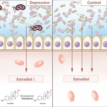 Исследователи из Уханьского университета (Wuhan University) в Китае обнаружили ранее неизвестный механизм, связывающий кишечные бактерии, эстрадиол и депрессию у женщин. Результаты исследования опубликованы в научном журнале Cell Metabolism. Предыдущие исследования показали, что хорошее настроение или депрессия могут быть связаны с уровнем эстрадиола. Эстрадиол является основной формой эстрогена в репродуктивном возрасте. У женщин в пременопаузе с депрессией наблюдались более низкие уровни эстрадиола, но причина данной корреляции не была известна. Текущее исследование было инициировано наблюдением, что уровень эстрадиола в крови женщин в пременопаузе с депрессией был примерно на 43% ниже. Эстрадиол попадает в кишечник после метаболизма в печени, а затем частично реабсорбируется обратно в кровь. Таким образом, исследователи проследили путь от образцов с низким содержанием в крови обратно к кишечнику. Образцы кишечной микробиоты были собраны у женщин в пременопаузе с депрессией и без нее