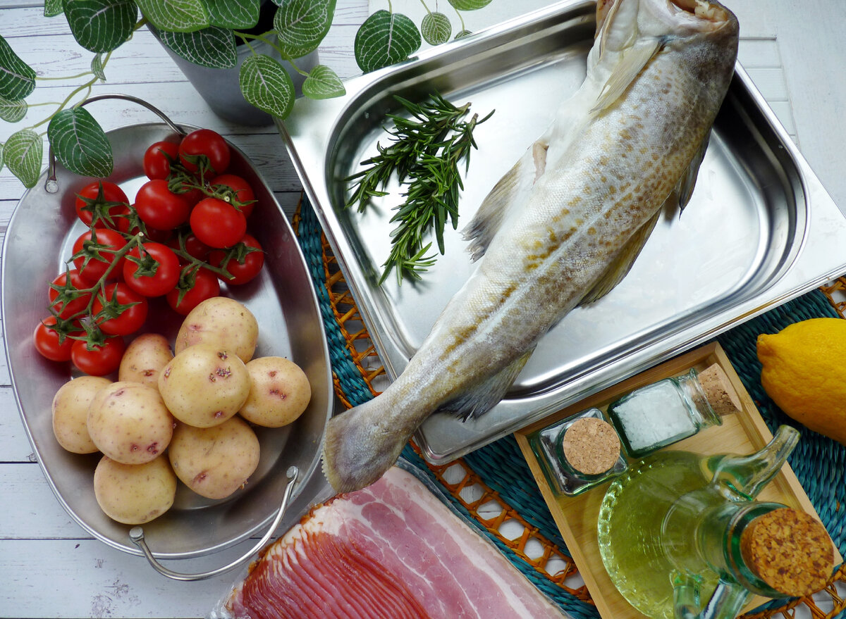 Треска в беконе с помидорами и картофелем с хрустящей корочкой