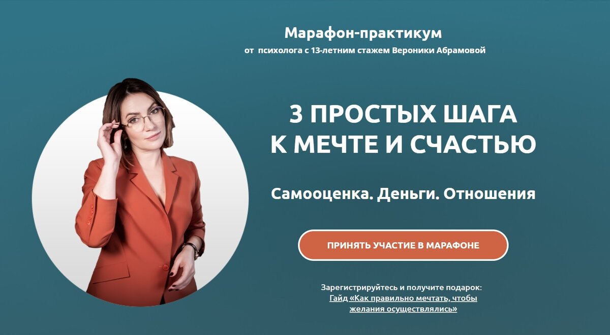 По какой причине одним людям счастье само плывет в руки, а другие вынуждены за него сражаться? Почему именно вам исполнение желаний дается с огромным трудом? Почему у других все получается, а у вас нет. Ответы вы найдете в марафоне-практикуме «3 простых шага к мечте и счастью». Вы сможете изменить реальность и жить легко и радостно. Даже если вы уперлись в финансовый потолок и не понимаете, как его пробить, Вероника Абрамова сможет помочь. Мечтаете исполнить мечту или найти свое предназначение? Приходите на марафон. После прохождения вы сможете быстро повысить доход, наладить личные отношения и реализовать творческий потенциал. Начнете свободно достигать желаемого и получать удовлетворение от жизни. Что вы узнаете на марафоне? Автор марафона Вероника Абрамова. Психолог, психодиетолог. Бизнес-тренер ICBT, коуч по стандартам ICF. Основатель онлайн-школы в сфере психологии и диетологии и закрытого клуба «Территория осознанности». Автор трансформационных игр, женских курсов и тренингов по
