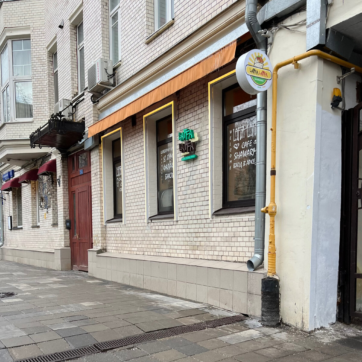 У самой кромки модного гастрорайона Москвы, именуемого Патриаршие пруды, в самом начале Малой Бронной, между Тверским бульваром и Большой Бронной, уже много лет проживает небольшое ближневосточное кафе Laffa Laffa от LL Group. Появилось заведение еще в 2014 году, задолго до вспышки энтузиазма по поводу вкусов Ближнего Востока, и долгое время вело себя тихо, держась особняком от буйного гастрокластера на Патриках. Но недавно, в конце 2022 года, туда партнером зашел известный блогер и критик Георгий Бекин, он же «Отец Фудоргий». С одной стороны от «Лаффы» находится «Есть хинкали, пить вино» – еще одно заведение той же сети, с другой арка и проход во двор, около которого припарковался автомобиль с армянскими номерами и мешками продуктов – это прибыла доставка товаров. Фасад простой: три окна с белыми надписями на стеклах, почти белая плитка, оранжевые навесы и кругляш вывески. Вход внутри арки, в ее дальнем конце.