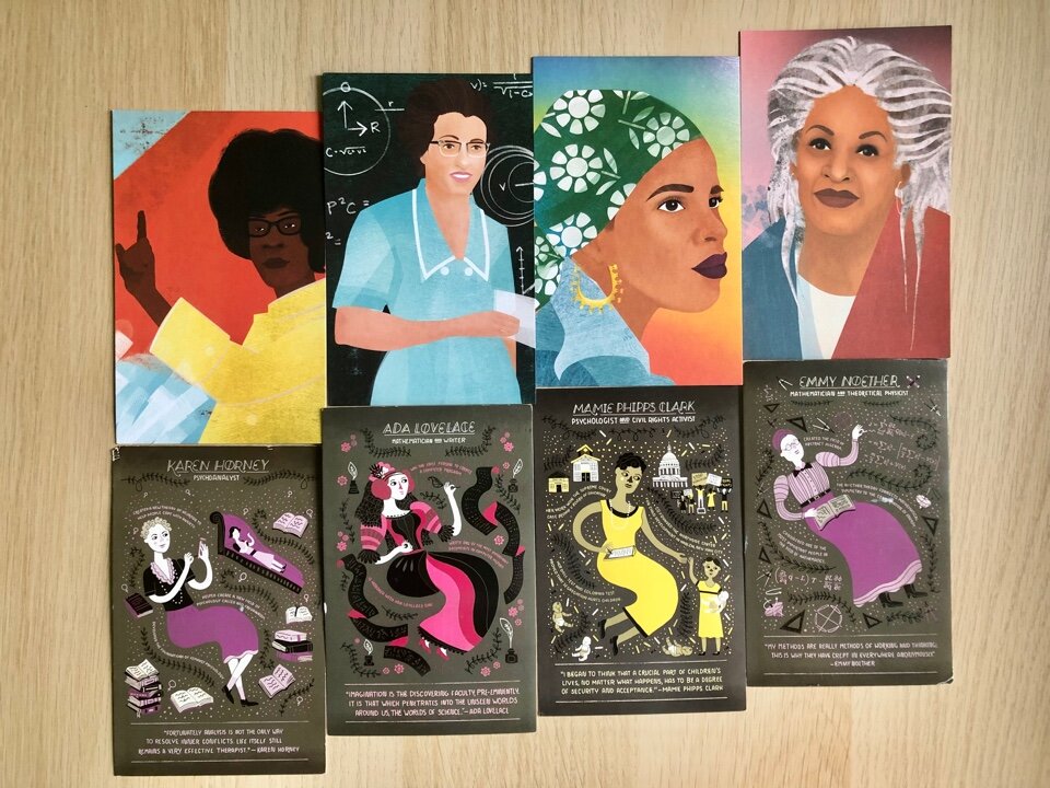 Открытки на фото выше прилетели из США (одна — из Италии), они из двух наборов, посвященных знаменитым женщинам, добившимся успехам в разных областях. И если в нижнем ряду информацию вынесли на лицевую сторону, то в верхнем: