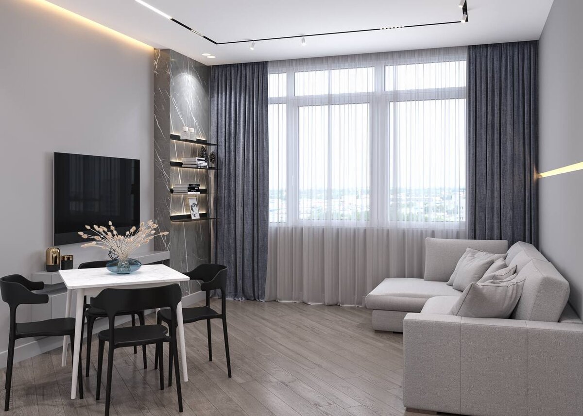 Небольшая площадь квартиры – это своего рода вызов для дизайнера интерьера. В дизайн студии «Мастерская Комфорта» мы тратим много времени для того, чтобы продумать интерьер маленьких квартир, сделать его визуально больше, красивым внешне и при этом максимально функциональным. Владельцы квартиры в ЖК «Лица» - молодая семейная пара, которые попросили создать современный интерьер с уклоном в минимализм. Для воплощения этого замысла пространство наполнилось спокойными формами, разнообразными фактурами, тонкими цветовыми сочетаниями. Квартира в ЖК «Лица» небольшая по площади, поэтому здесь очень важно было продумать эргономику пространства. Совмещенная зона кухни и гостиной позволила создать открытое пространство, наполненное светом и воздухом, а гармоничное сочетание белого цвета с серыми оттенками позволило сделать образ гостиной завершенным. Чтобы визуально увеличить небольшое пространство спальни, мы сделали светлые стены, насытили комнату тонким сочетанием светло-серого и белого, а над