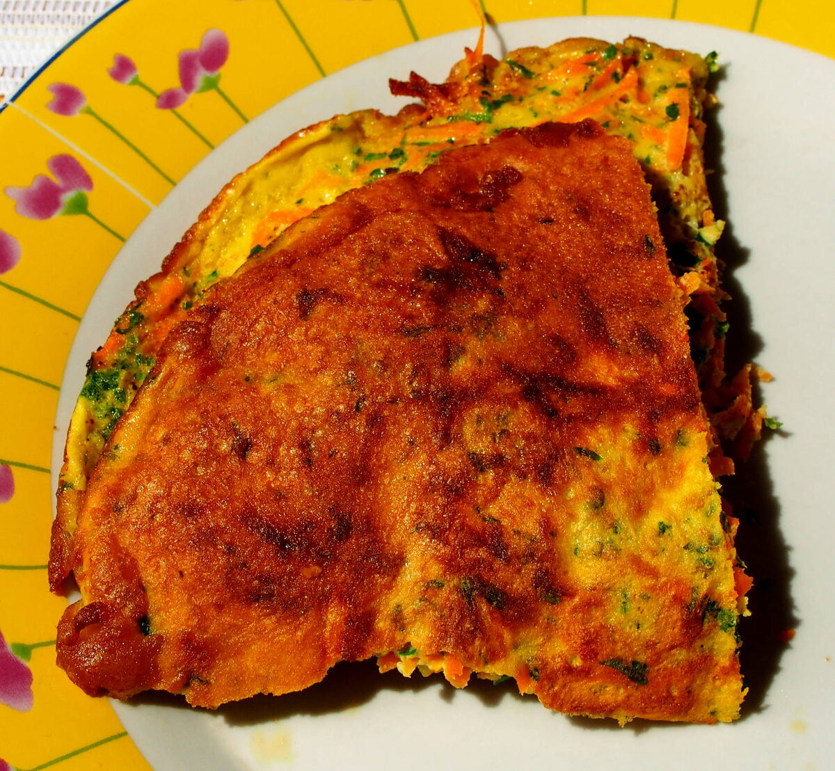 Омлет с овощами и сыром Ингредиенты: 2 яйца 1 морковь (средняя) 1 лук-порей (средний) 50 грамм твердого сыра соль и перец по вкусу 2 столовые ложки растительного масла Приготовление: Шаг 1: Очистите и нарежьте мелко морковь и лук-порей. Шаг 2: Разогрейте сковороду и добавьте растительное масло. Шаг 3: Добавьте морковь и лук-порей в сковороду и обжарьте на среднем огне до мягкости. Шаг 4: Взбейте яйца с солью и перцем. Шаг 5: Положите яичную смесь на сковороду к овощам и обжаривайте до готовности. Шаг 6: Сыр натрите на мелкой терке. Шаг 7: После того, как омлет готов, посыпьте его натертым сыром и подождите, пока сыр начнет плавиться. Шаг 8: Сервируйте горячим, посыпав свежими зелеными травами. Приятного аппетита!