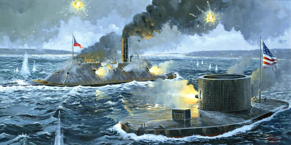 Первое в новой истории сражение Пароходов (броненосцев) "Монитор" и "Мерримэг" (Вирджиния) Понятное дело, корабли нового типа тут же заинтересовали военных. Кстати, первый боевой пароход, «Демологос», был построен в США все тем же Робертом Фултоном. Он был спущен на воду в 1814 году и предназначался для войны между Англией и США. боевой пароход, «Демологос» Он нес на борту 20 артиллерийских орудий, но был столь неуклюж и малоподвижен, развивая с помощью гребного колеса скорость всего 5 миль в час, что до театра военных действий так и не добрался. И погиб в 1829 году в результате случайной аварии. Первым винтовым военным пароходом стал французский «Наполеон». Таковы гримасы истории – император отверг пароход Фултона, но тем не менее первый паровой линкор носил его имя. Корабль построил в 1850 году известный изобретатель Станислав Дюпюи де Лом. Водоизмещение корабля составляло 1870 тонн, скорость – 13,5 узла, а на борту размещалось 90 орудий. Для защиты же от вражеского огня в